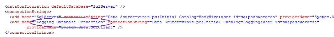 Using the name of the logging database connection create a logging configuration tag in web.config as follows